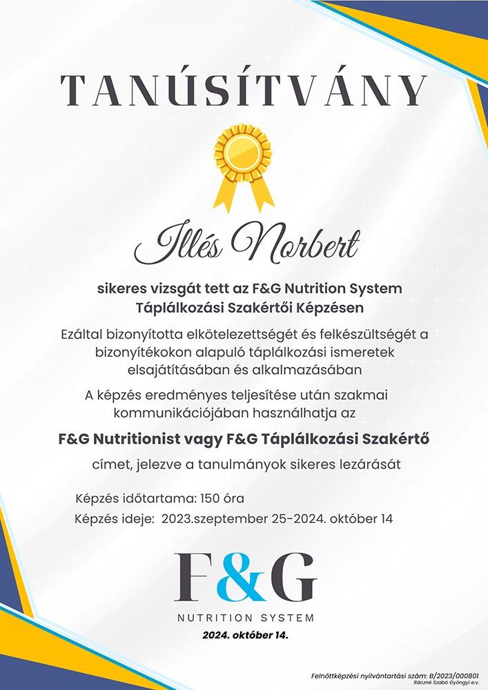 2024-ben sikeres vizsgát tettem kiváló eredménnyel az F&G nutrition bizonyítékon alapuló táplálkozási szaktanácsadóként.